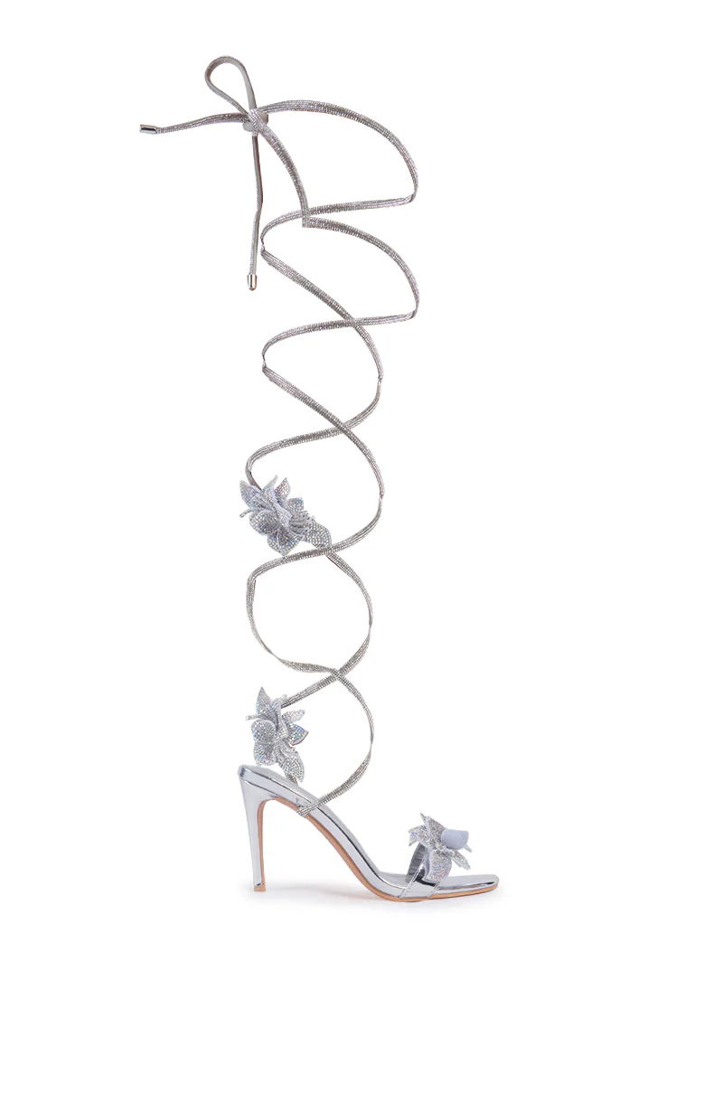Glittering and glam. The AZALEA WANG Marcello Silver Rhinestone Flower And Rope Sandal is crafted from a metallic faux leather upper and features an open almond toe silhouette, a slim stiletto heel, a wide toe band with a rhinestone flower accent, a Comfort Cushion insole, and coordinating knee-high rhinestone wrap-around lace-up ankle straps with two additional flower accents.
