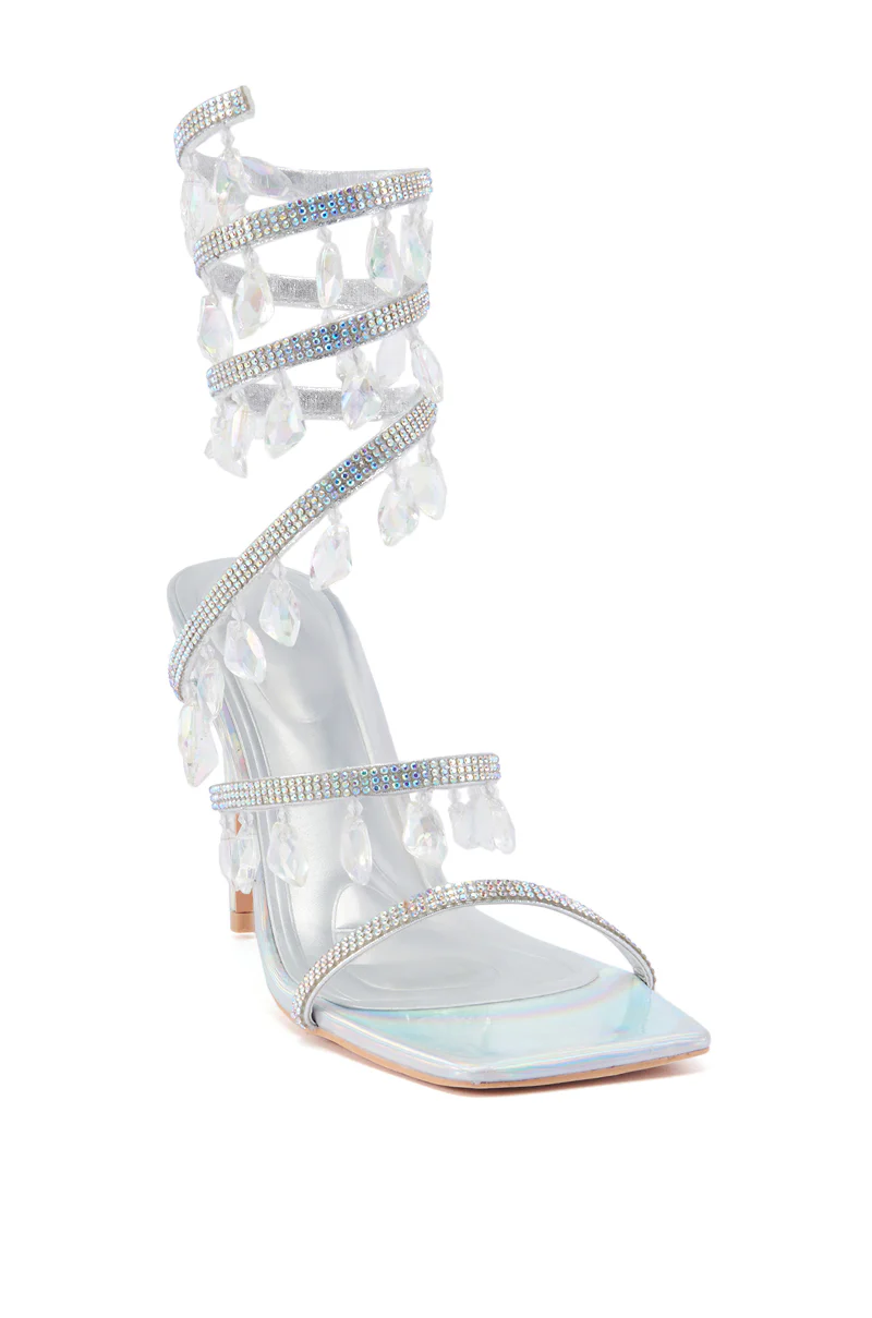 The AZALEA WANG Reiko Silver Holographic Spiral Sandal is a faux patent leather style that features an open square toe silhouette, slim stiletto heel, cushioned insole, and slim, coordinating toe and foot bands. Complete with a spiral shaft that wraps around the ankle, adorned with opulent rhinestones and dangling gem embellishments.Â
