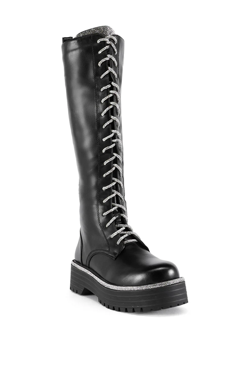 Grunge and glamor collide in The AZALEA WANG Sarai Lace Up Boot. These cool-girl combat boots are crafted from smooth faux leather and feature a knee-high silhouette, a platform lug sole with a coordinating chunky heel, an inner-ankle zipper closure, and pull-on tabs. Theyāre complete with a lace-up front panel boasting silver rhinestone-adorned laces, a rhinestone-embellished tongue, and glittering rhinestone trim around the soleās perimeter. Wear them to the next concert on your calendar and steal the show!Ā