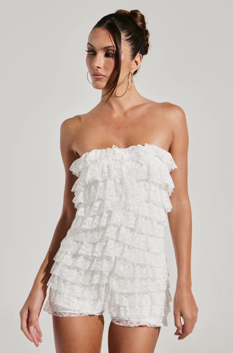 So coquette, so demure. The AKIRA Label Desert Time Romper is crafted from a delicate lace fabrication and features a strapless neckline with scalloped trim and inner elastic trim, a paneled construction of lace ruffles, a stretchy inner lining with attached shorts, and a ribbon lace accent at the chest. Complete with an easy, pull-on design. Style with dainty jewelry and knee high moto boots for the perfect mix of sassy nâ sweet.