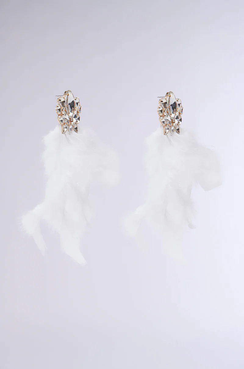 Step into your best self with The AKIRA Label Empower Feather Earring. This luxury statement accessory is crafted from a faux gold metallic base and features ornate gemstone-embellished lobe posts with extravagant, dangling feather detailing. Complete with classic post back-style closures.
