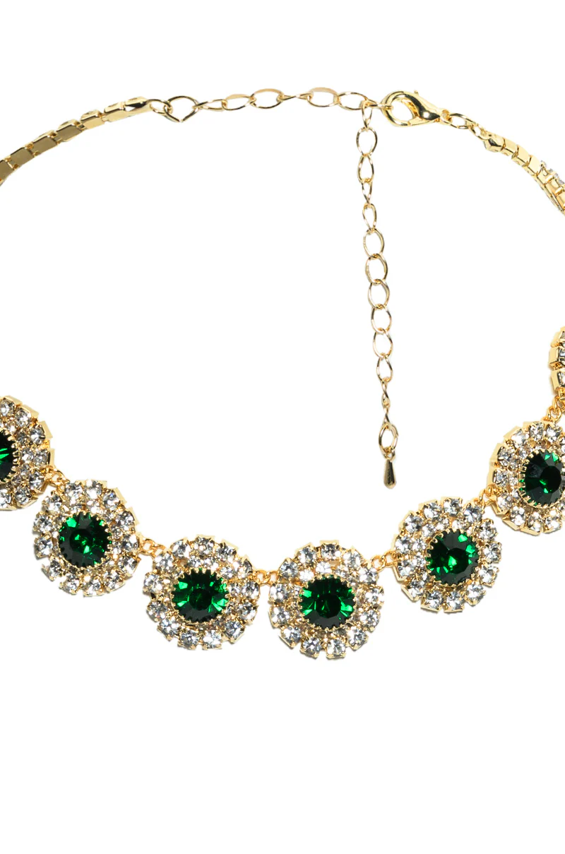 The AKIRA Label Esmeralda Embellished Choker is made from a faux gold metal fabrication and features a rhinestone chain link choker silhouette and pave rhinestone pendants with colorful gem centers. Complete with an adjustable lobster clasp closure.
