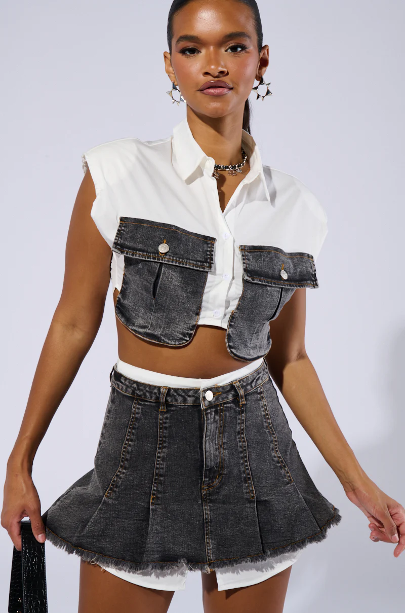 Youâre making all the right moves in The AKIRA Label Get It Right Cropped Button Down Shirt. Crafted from a stretchy, crisp white poplin base fabrication, this top features a cropped fit, a sleeveless silhouette with padded shoulders, a tonal button down front closure, and a pointed collar. Itâs complete with oversized, fold-over denim breast pockets with button closures. Style it with the  complementary Get It Right Distressed Denim Pleated Skirt for a coordinated look.Â