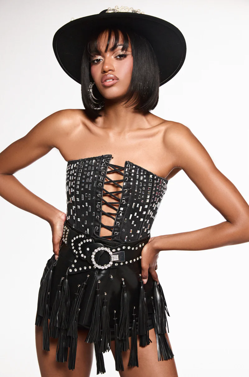 You are the prize in The AKIRA Label I’m Worth It Tassel Belt. This grunge-chic accessory is crafted from a non-stretch faux leather base and features cut out accents with strappy detailing at the top hem, faux silver metallic stud hardware throughout, and cascading layers of tassel detailing on the bottom hem.