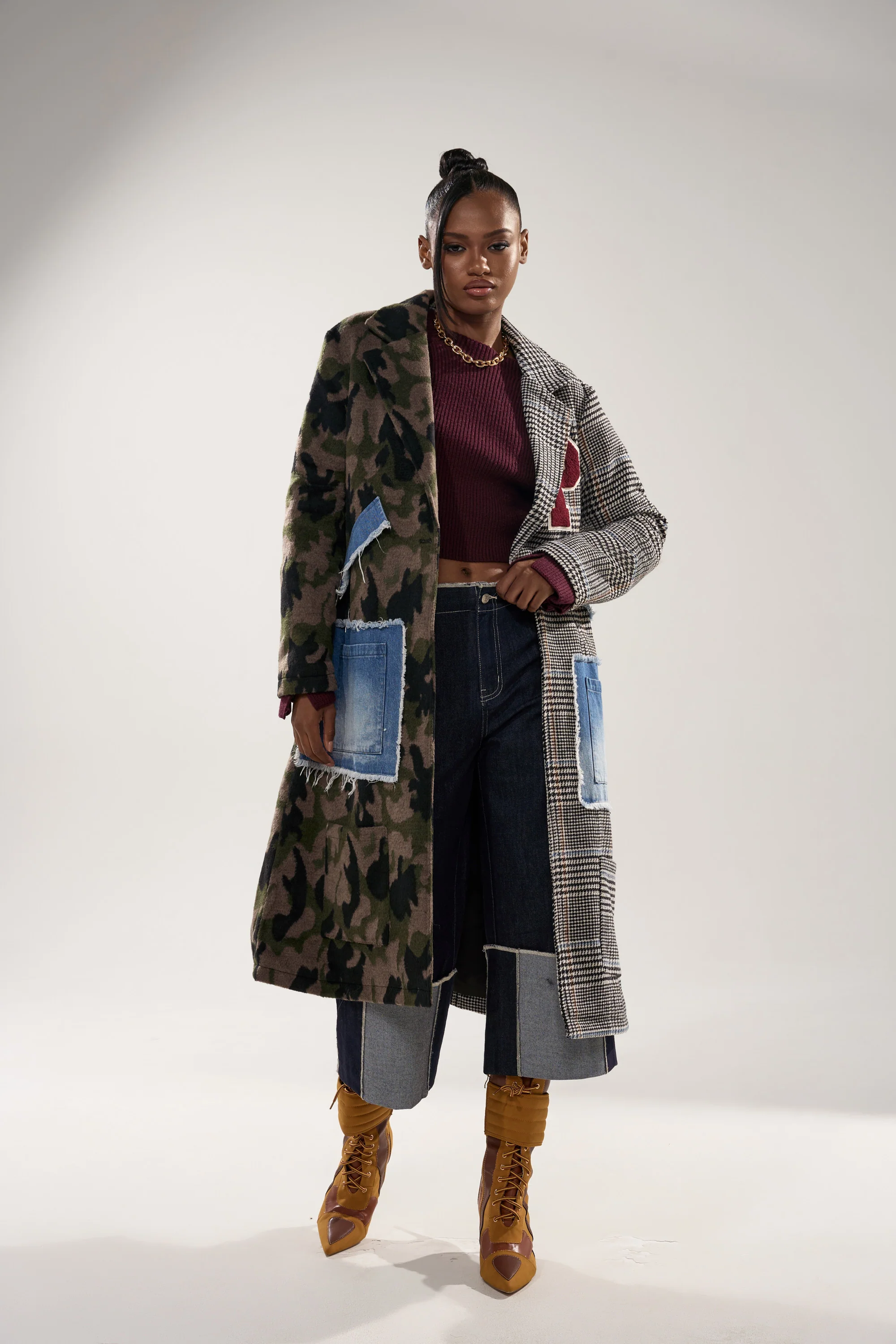 Never feel indecisive in The AKIRA Label Maddix Half Half Trench. This bold outerwear piece features a split camo pattern on one side and a gingham print on the other, a plunging neckline with a notch lapel collar, long sleeves, distressed denim pockets and denim trim accents on the front, one camo pocket and one gingham pocket on the lower bottom hems of their coordinating sides. Complete with a sleek inner lining, a single button front closure, a back vent slit, and a longline silhouette.