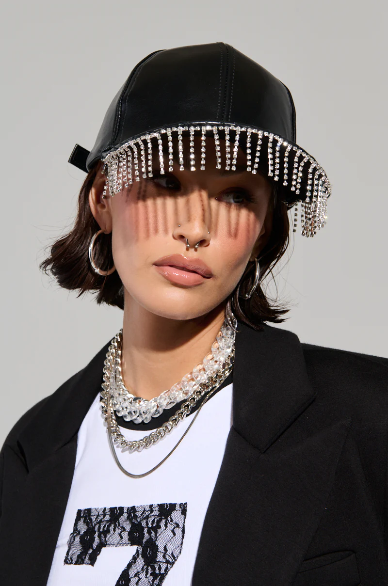 Blind your haters with your bling. The AKIRA Label Raining Diamonds Fringe Hat is crafted from a faux leather base and features a traditional baseball cap silhouette, a classic six-panel construction, and an adjustable buckled strap in the back for a custom fit. Complete with a wide, curved brim with dangling rhinestone chain link detailing on the underbrim for a fabulous finish.