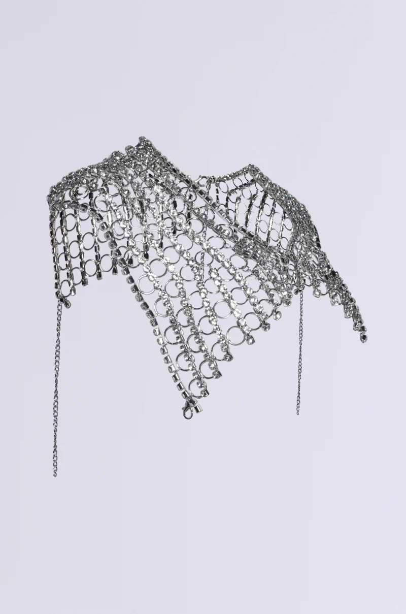If ya got it, flaunt it! The AKIRA Label Rich Bish Statement Necklace is crafted from a flexible, unlined silver metallic rhinestone chain link base and coordinating interlocking o-ring hardware. It features a high mock neckline, a wide silhouette that drapes across the shoulders, and pointed hems. Complete with cascading silver chain link accents.Â