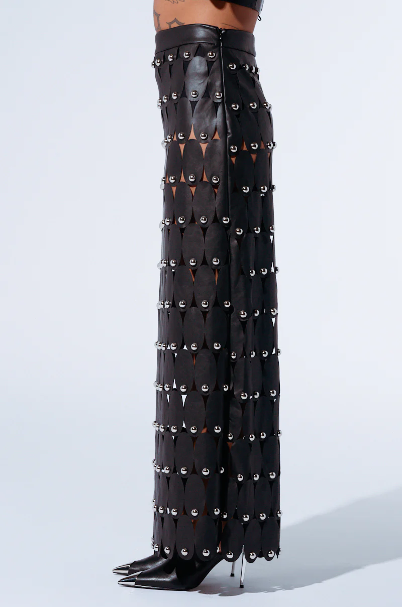 THE SNEAK PEEK STUDDED PU MIDI SKIRT IN BLACK