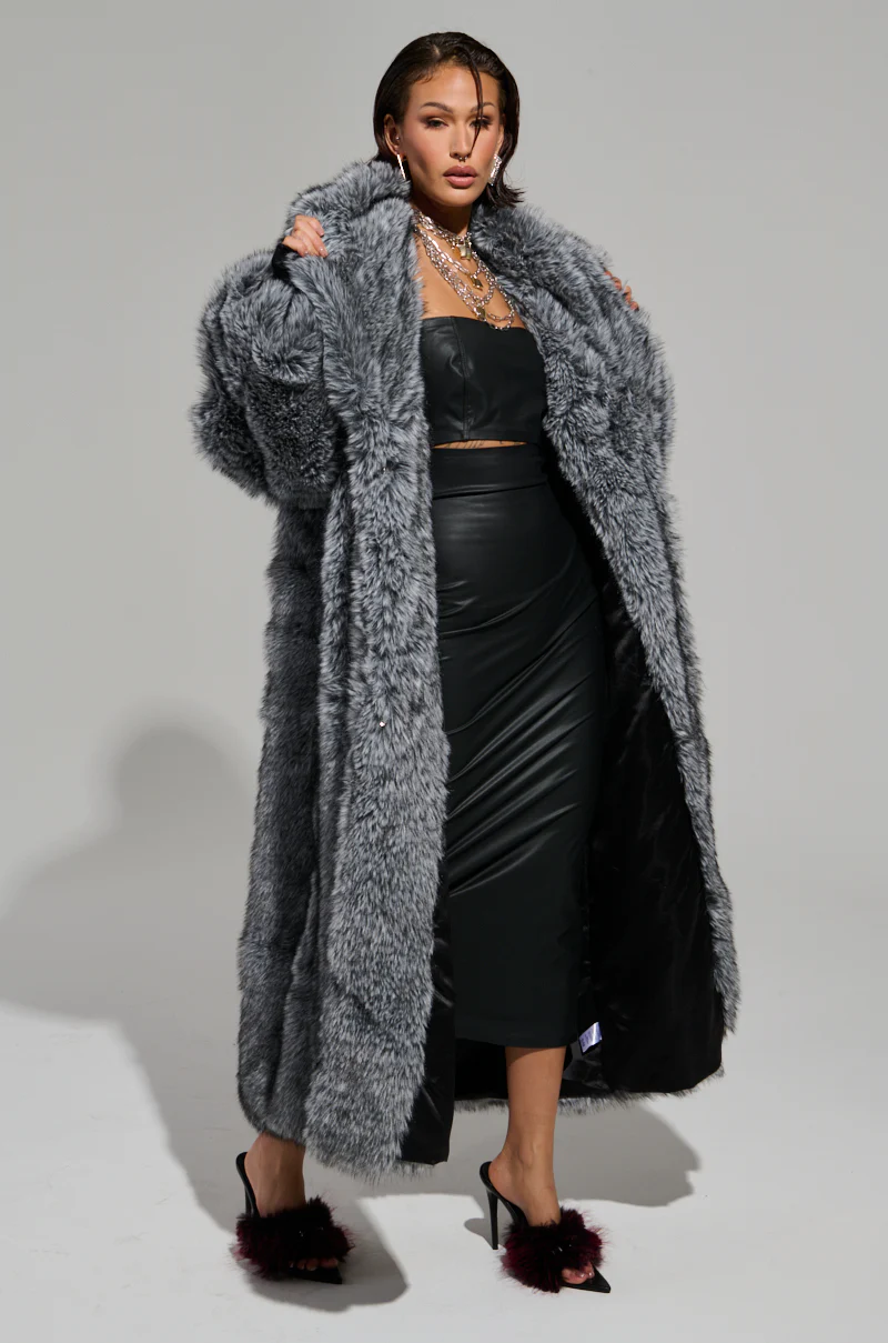 Dressing for the cold doesnât have to be dull. The AKIRA Label Tsunami Faux Fur Trench is designed to keep you toasty and â more importantly â stylish no matter the temps this winter. Crafted from impossibly soft faux fur, this luxe longline coat features an oversized fit, a wide fold-over collar, long sleeves with ribbed knit cuffs, spacious waist pockets, and a sleek, satin-lined interior. Complete with three concealed hook and eye front fastenings.Â